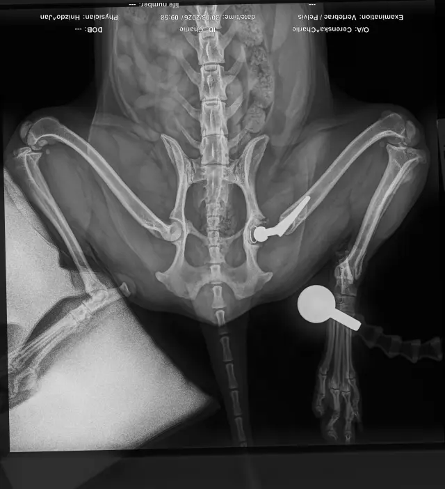 Charlieho endoprotéza musí k akutní revizi, termín operace je už 2. 4. 2026. Jsou 3 možnosti, co se momentálně dá udělat, nicméně co bude pro něj nejvhodnější se zjistí pan doktor až na sále dle aktuálního stavu cementu a kosti. 😓