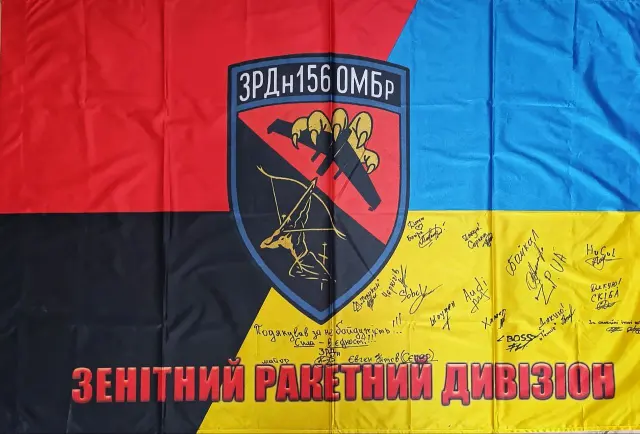 Chlapi ze 156. brigády poslali podepsanou vlajku, jako znak vzájemné úcty a poděkování za pomoc: