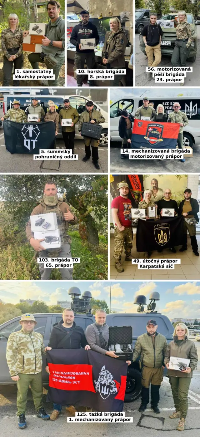 V pěti kolech sbírky (milníky 1–34) jsme nakoupili a doručili 48 dronů různých typů pro 23 samostatných frontových jednotek.