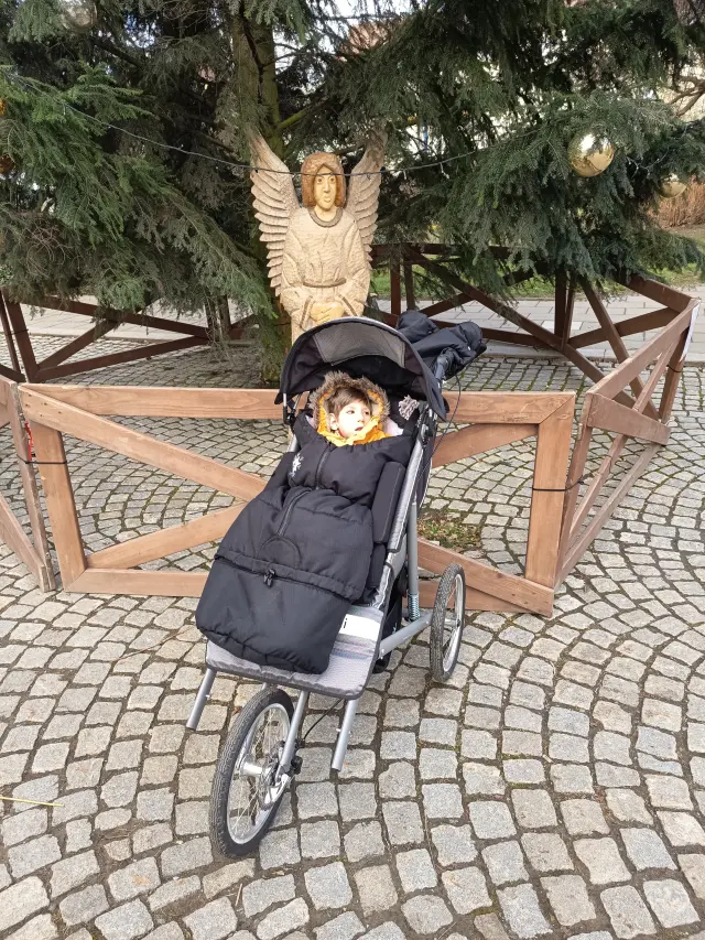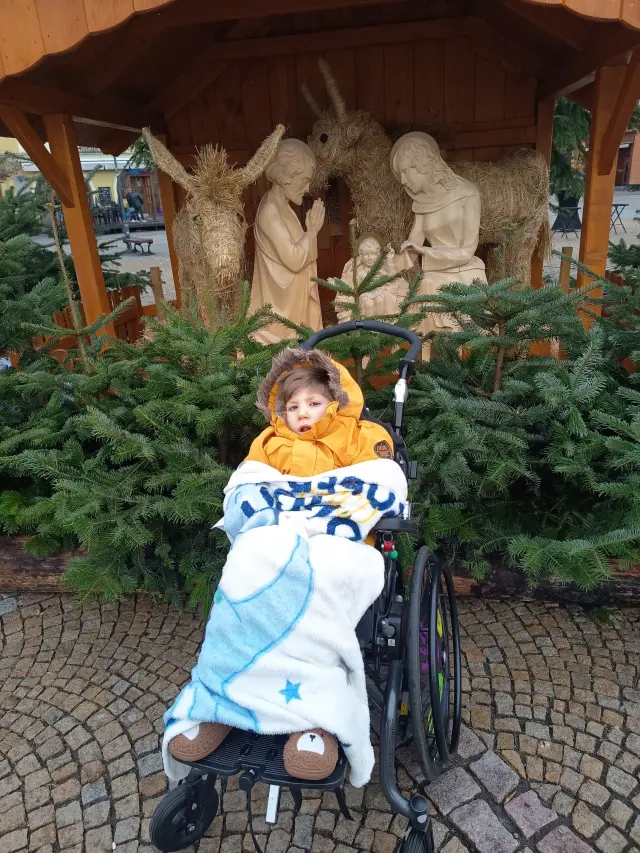 Adventní čas trávíme společně venku, kdykoli to Ivánkův zdravotní stav dovolí. Udělali jsme si krátké výlety k vánočnímu stromu a betlému – a i když je to pro Ivánka náročné, světýlka a atmosféra Vánoc ho vždycky krásně uklidní.