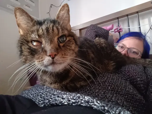 Dobré zprávy z veteriny jsou, že se zřejmě nejedná o neurologický symptom, ale „jen“ infekci víčka, na kterou jsme dostali mast a čeká nás kontrola. Tak držte palce, ať to zmizí! Díky 🖤