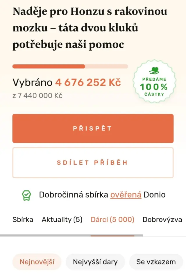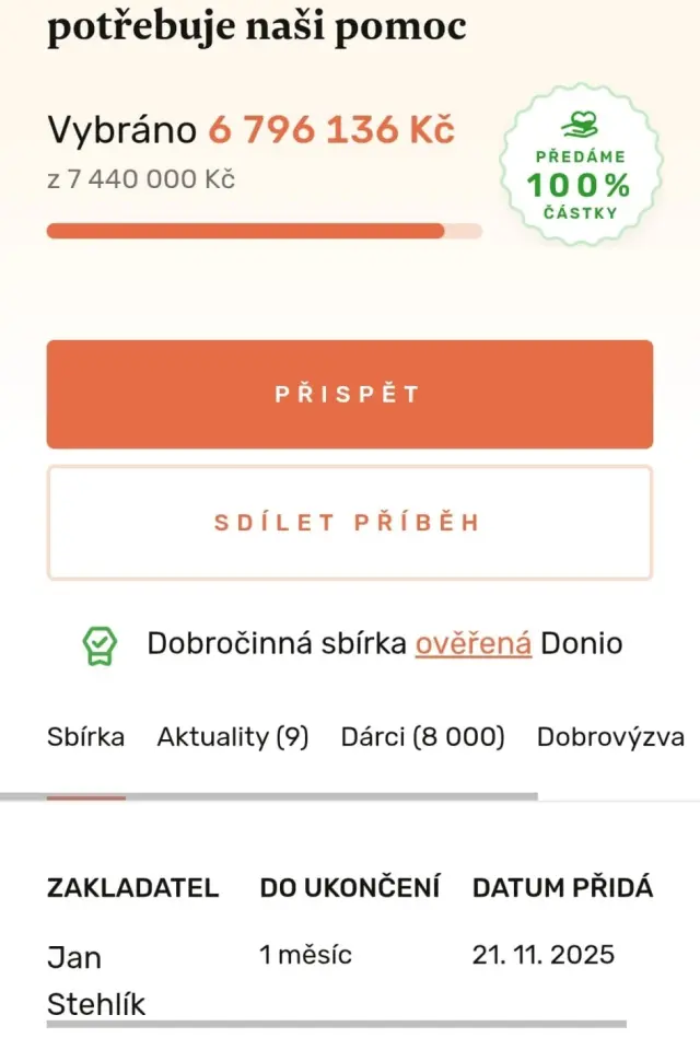 Když jsem sbírku zakládal, ani ve snu by mě nenapadlo, kolik solidarity a laskavosti se mezi vámi najde. Každý váš příspěvek, každé sdílení i každá povzbudivá zpráva mi dodávají ohromnou sílu bojovat dál. Díky vám vím, že v tom nejsem sám.
