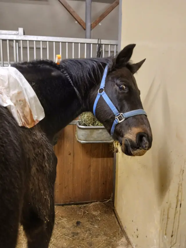 ve čtvrtek jsme byli propuštěni z kliniky,cesta domů byla náročná a dlouhá,ale vše jsme zvladli. Nitis se radostně přivítal s ostatními koníky a pak odpočíval. Má klidový režim, bere atb a pooperační ránu mám ošetřovat už jen medem. Tento týden začínáme  rehabilitaci s MLS laserem a Bemerem. 🍀