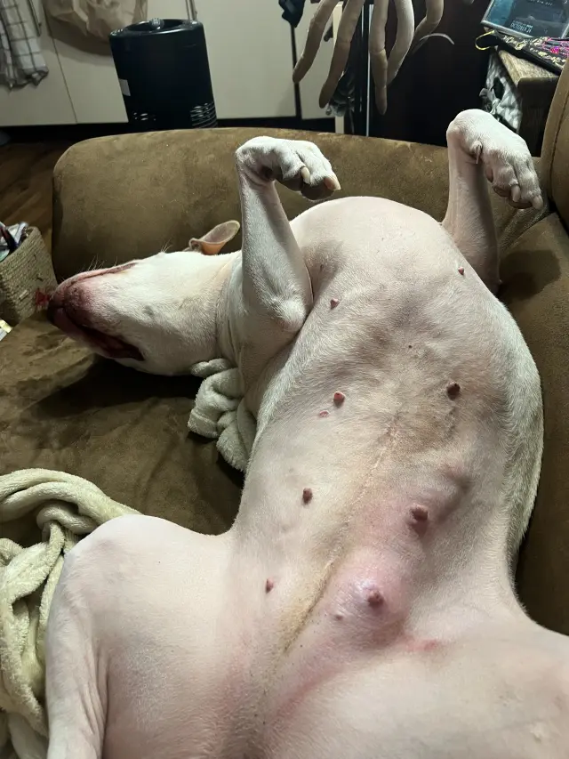 Emilce se objevily výrazné boule na mléčné liště. Momentálně máme potvrzený zánět, nasazenou léčbu a čekáme, zda léky zaberou. Jakmile se stav uklidní, bude provedena citologie, aby se s jistotou vyloučilo vážnější onemocnění. Bohužel zatím není nic uzavřené a každý další krok závisí na tom, jak Emilka na léčbu zareaguje.
