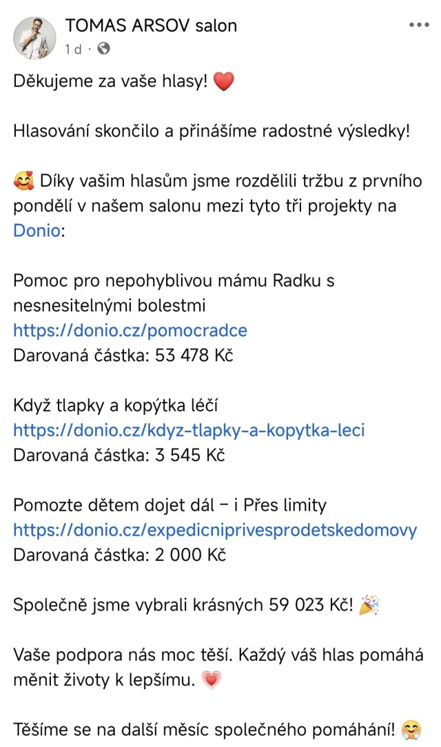 Před nedávnem proběhlo také pravidelné hlasování o rozdělení tržby kadeřnického salonu skvělého Tomáše Arsova, kde díky hlasům spousty z Vás, bude na mou sbírku darováno nádherných 53 478 Kč.