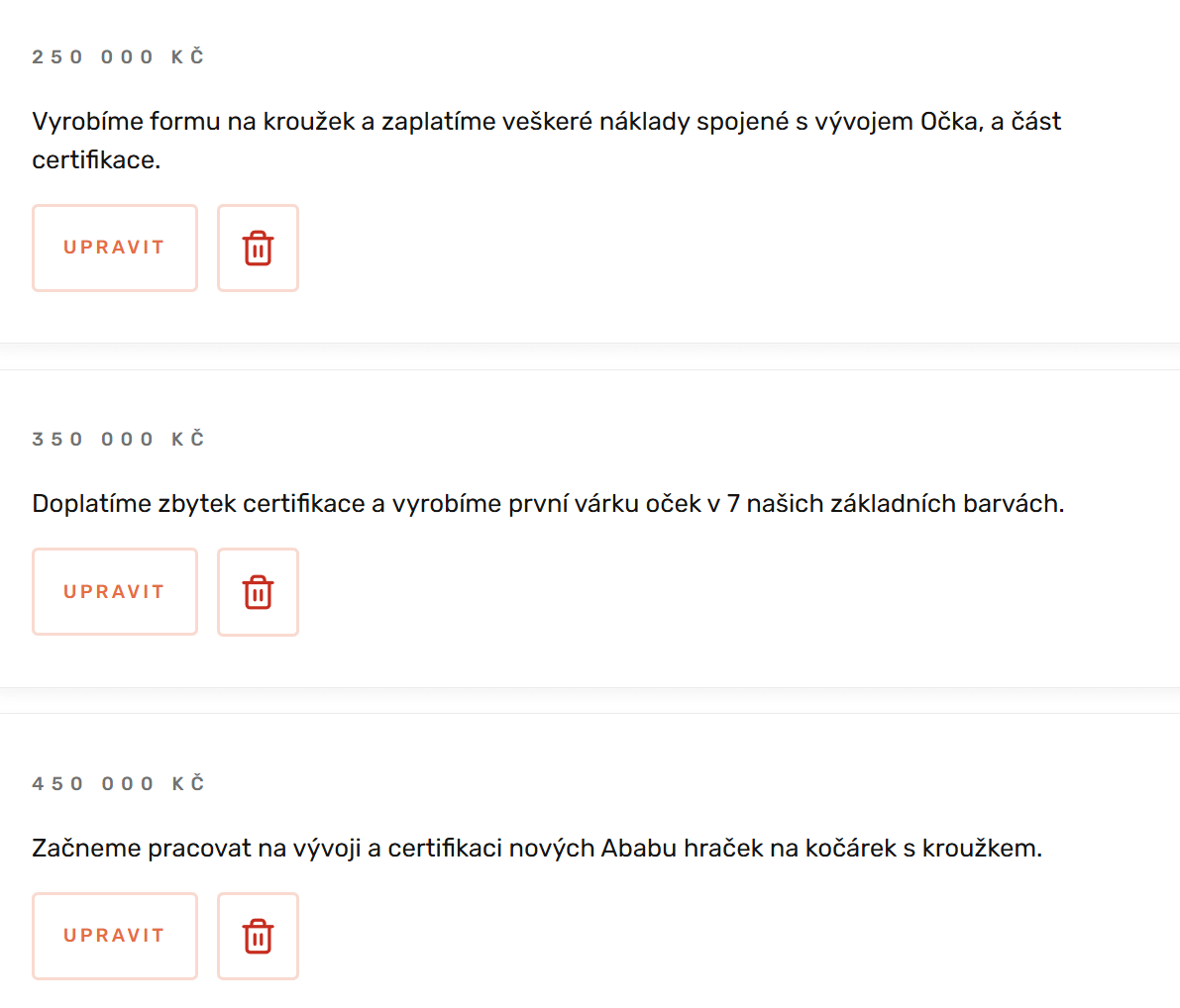 Hezky zpracované milníky měl také projekt Očko pro Ababu | Podpořte výrobu kroužků na české hračky.